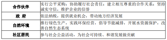 對利益相關(guān)者的法律責(zé)任,這一責(zé)任主要包括企業(yè)根據(jù)《中華人民共和國公司法》、 《中華人民共和國合同法》等法律法規(guī),對出資人、債權(quán)人、供應(yīng)商、合作商、客戶、社區(qū)及其它社會團體等所有利益相關(guān)者必須遵守各類合同,按照法律規(guī)定進行利益分配,為社會提供最基本的產(chǎn)品和服務(wù)質(zhì)量保證,不損害企業(yè)所在社區(qū)的合法權(quán)益,不影響其它社會團體的利益等內(nèi)容。