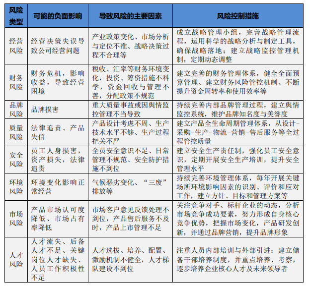 公司創(chuàng)立至今,在取得眾多成就的同時,不斷強化風(fēng)險意識,推動組織的持續(xù)經(jīng)營。為此,公司經(jīng)營管理團隊嚴(yán)格把控各部門工作中可能存在的風(fēng)險點,密切關(guān)注外部環(huán)境中的潛在風(fēng)險因素,積極采取風(fēng)險預(yù)防措施,在國家政策、市場需求、產(chǎn)品質(zhì)量、財務(wù)資金、運營管理等方面嚴(yán)格推行風(fēng)險監(jiān)測與保持風(fēng)險敏感性,高層領(lǐng)導(dǎo)不斷向公司各級員工灌輸風(fēng)險意識,強調(diào)市場競爭的殘酷性及環(huán)境的復(fù)雜性,最小化各種潛在風(fēng)險對公司的影響。在內(nèi)部運營風(fēng)險管理方面,公司對主要內(nèi)部運營風(fēng)險評價指標(biāo)進行識別并采取預(yù)防措施,如財務(wù)管理每年定期對應(yīng)收賬款進行動態(tài)跟蹤與管理,防范呆賬和壞賬風(fēng)險。